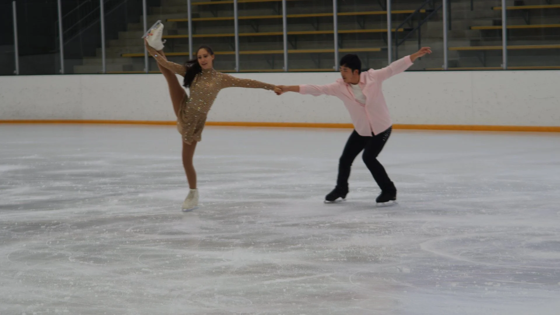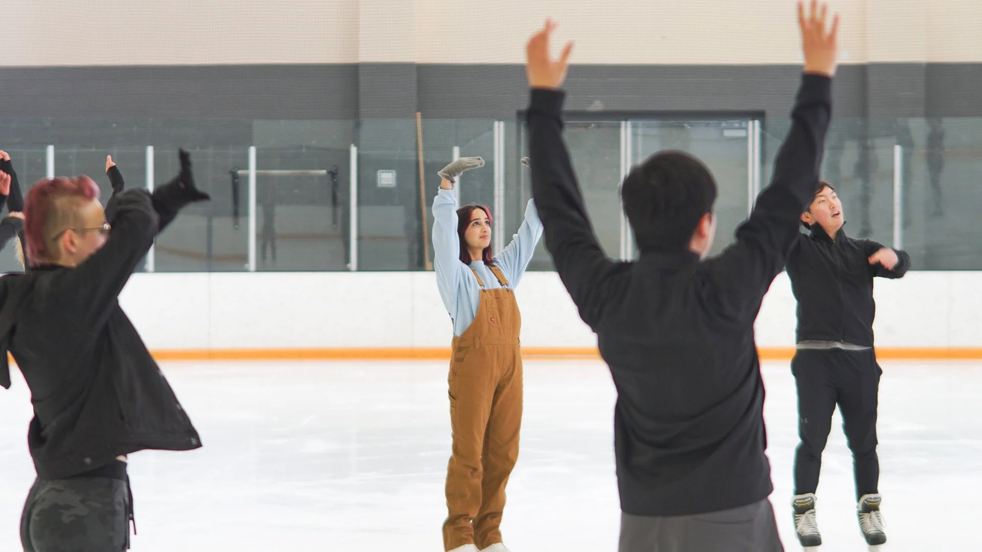 Two people at an ice skating rink; a woman in a black jacket and a light blue skirt points at someone off-camera with her thumb, while a man in a red shirt stands behind her, giving a thumbs-up.