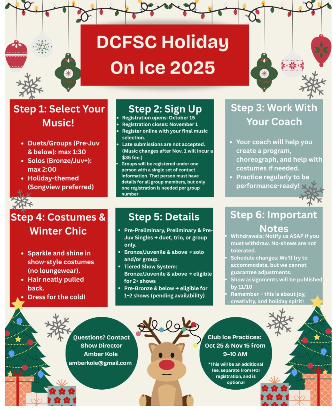 Must be duets or trios, meaning programs skated to holiday music with 2 or 3 students doing a program together. Around $50 to register, registration open in October. Needs to be choreographed by a coach and costumes are purchased by skaters.